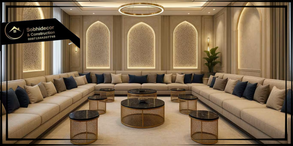تصميم المساحات الواسعة مع توزيع مناطق الجلوس بطريقة توفر الراحة للضيوف والعائلة، مع اختيار ألوان تتناغم مع أجواء المكان.